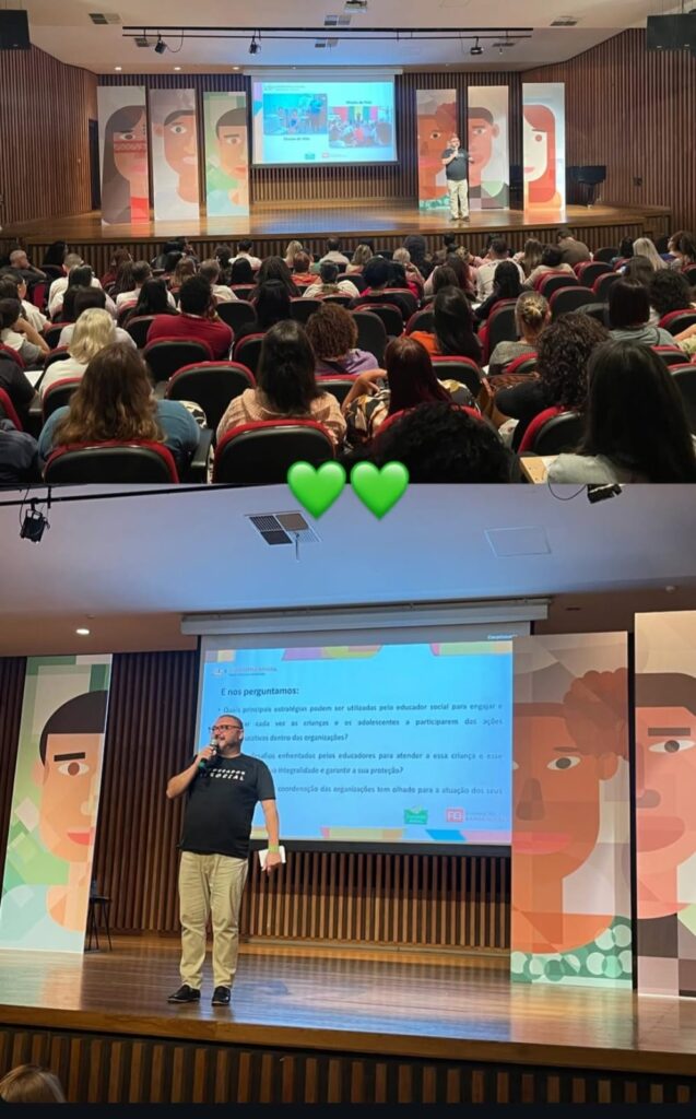 Durante a Palestra, Inaldo Araújo abordou a experiência pessoal como Educador Social e a suas vivências no cotidiano da Instituição, o cuidado com as crianças, os desafios e principalmente a importância do Educador Social como ponte para efetivar o pertencimento da criança e seu poder de transformação